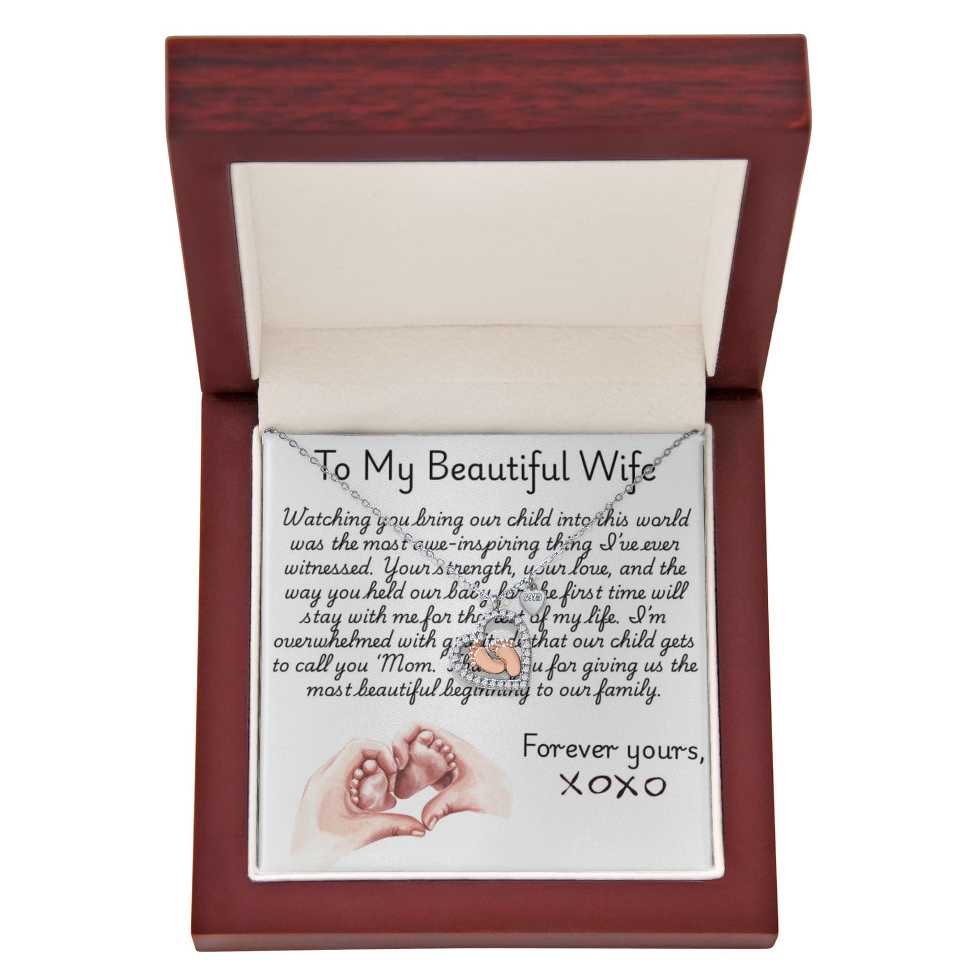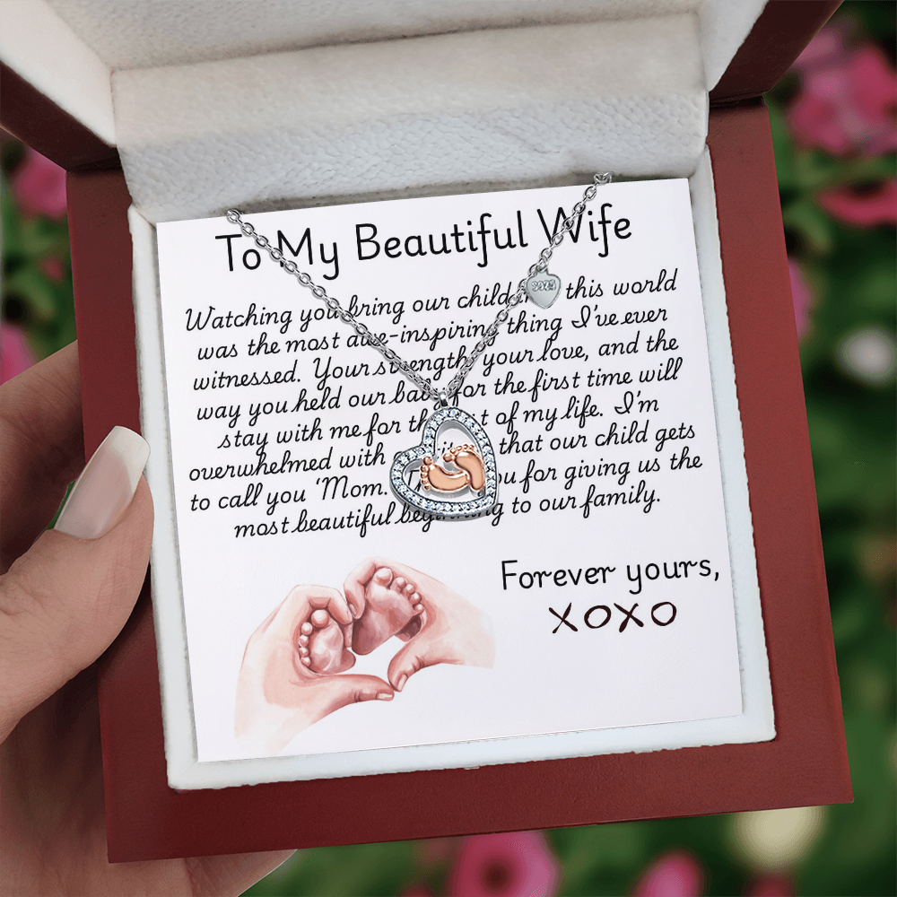 Imagine her reaction receiving this heartfelt symbol of love, family, and precious beginnings. The Baby Feet Heart Necklace features a sparkling heart-shaped frame adorned with shimmering cubic zirconia, surrounding a delicate pair of rose gold baby feet. A touching tribute to motherhood and new life, this necklace is the perfect way to celebrate a new mom, a cherished child, or a growing family.